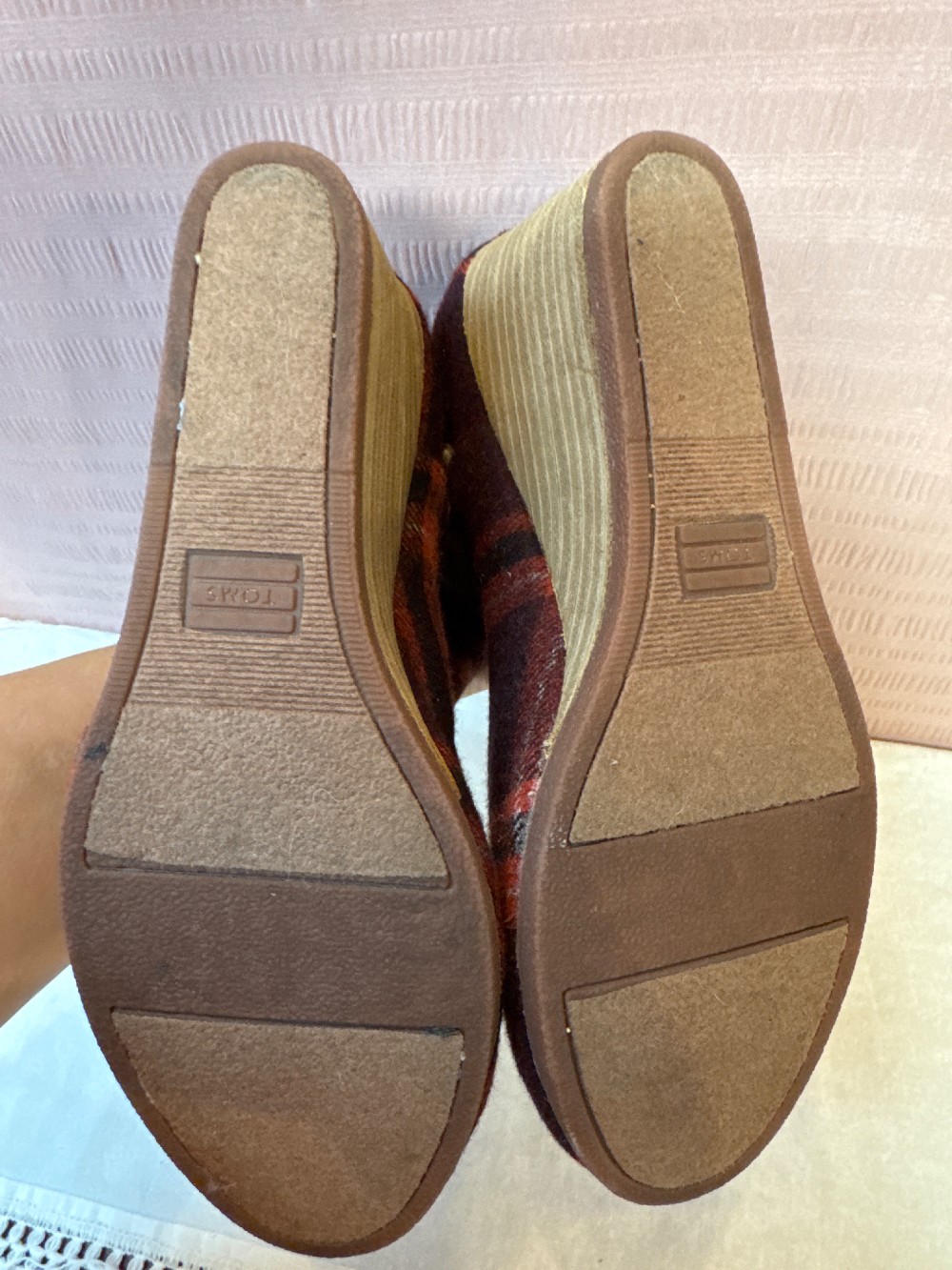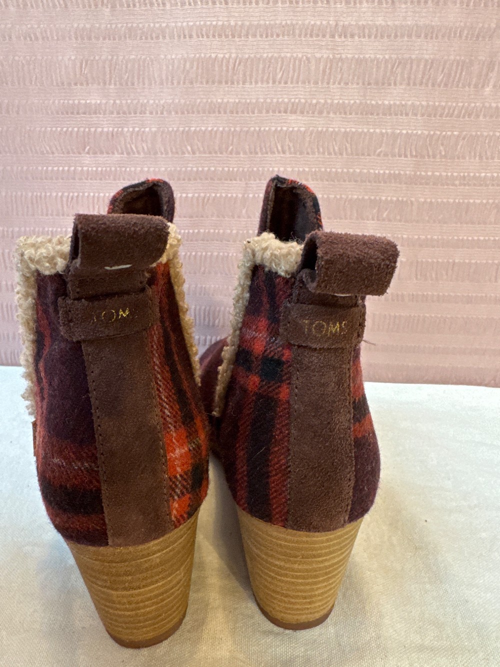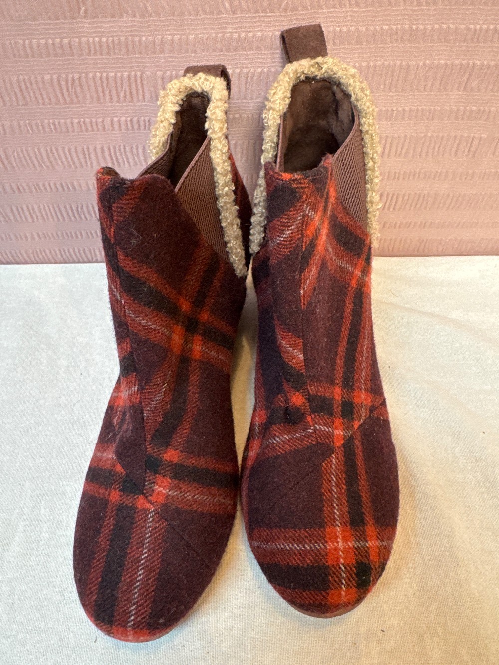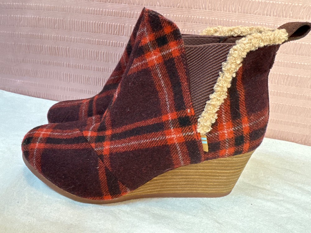 Home / Boots / TOMS Red Plaid Kelsey Wedge Wool Booties